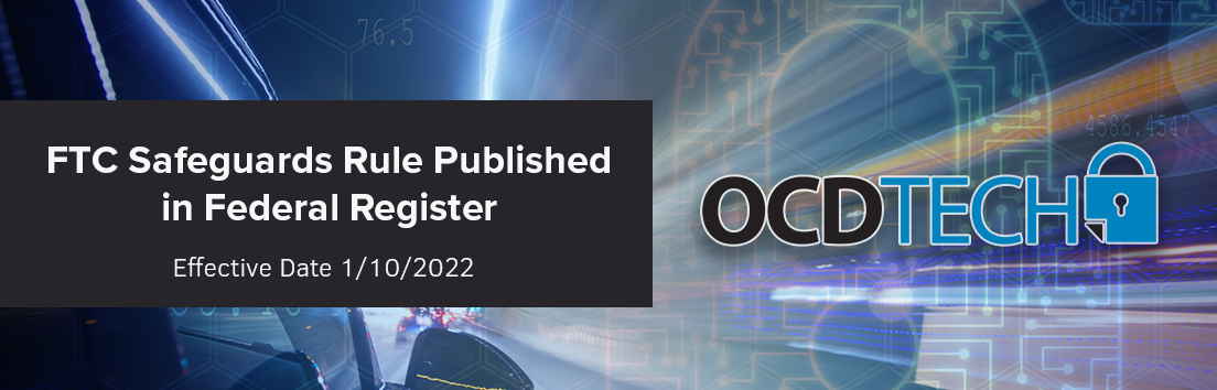This means that starting January 10, 2022 organizations will begin to be required to implement the provisions within the FTC Safeguards Rule.As part of this Final Rule, the deadline for complying with the provisions that organizations were originally given 6 months to meet has been extended to one year. This means that the following requirements in the Rule will need to be met by December 9, 2022:- 314.4(a) the appointment of a Qualified Individual- 314.4 (b)(1) conducting a written risk assessment- 314(c)(1) through (8) setting forth the new elements of the information security program- 314.4(d)(2) requiring continuous monitoring or annual penetration test- 314.4(e) requiring training for personnel- 314.4(f)(3) requiring periodic assessment of service providers- 314.4(h) requiring a written incident response plan- 314.4(i) requiring an annual written report from the Qualified Individual.This encompasses all major requirements of the rule, meaning that organizations now have one year to build their compliance program, implement any new technologies, and to hire a Qualified Individual.If your organization needs assistance complying with the FTC Safeguards Rule, please reach out to Kate Upton or Michael Hammond here at OCD-Tech. OCD-Tech has a tailored program to help organizations meet each requirement and can fit this program to each organization’s unique needs.
